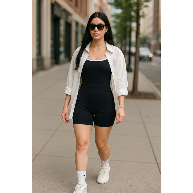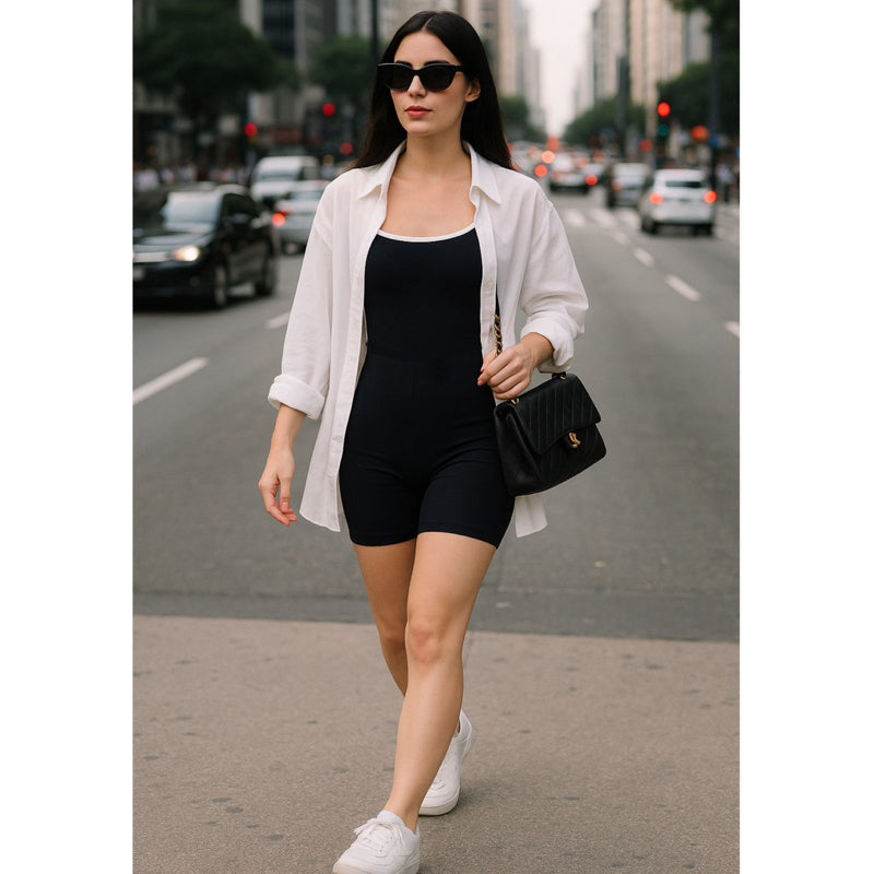 Combine o Macaquinho Duany com tênis esportivos para um visual de treino completo. Para um estilo mais casual, adicione uma jaqueta ou um cardigã leve.